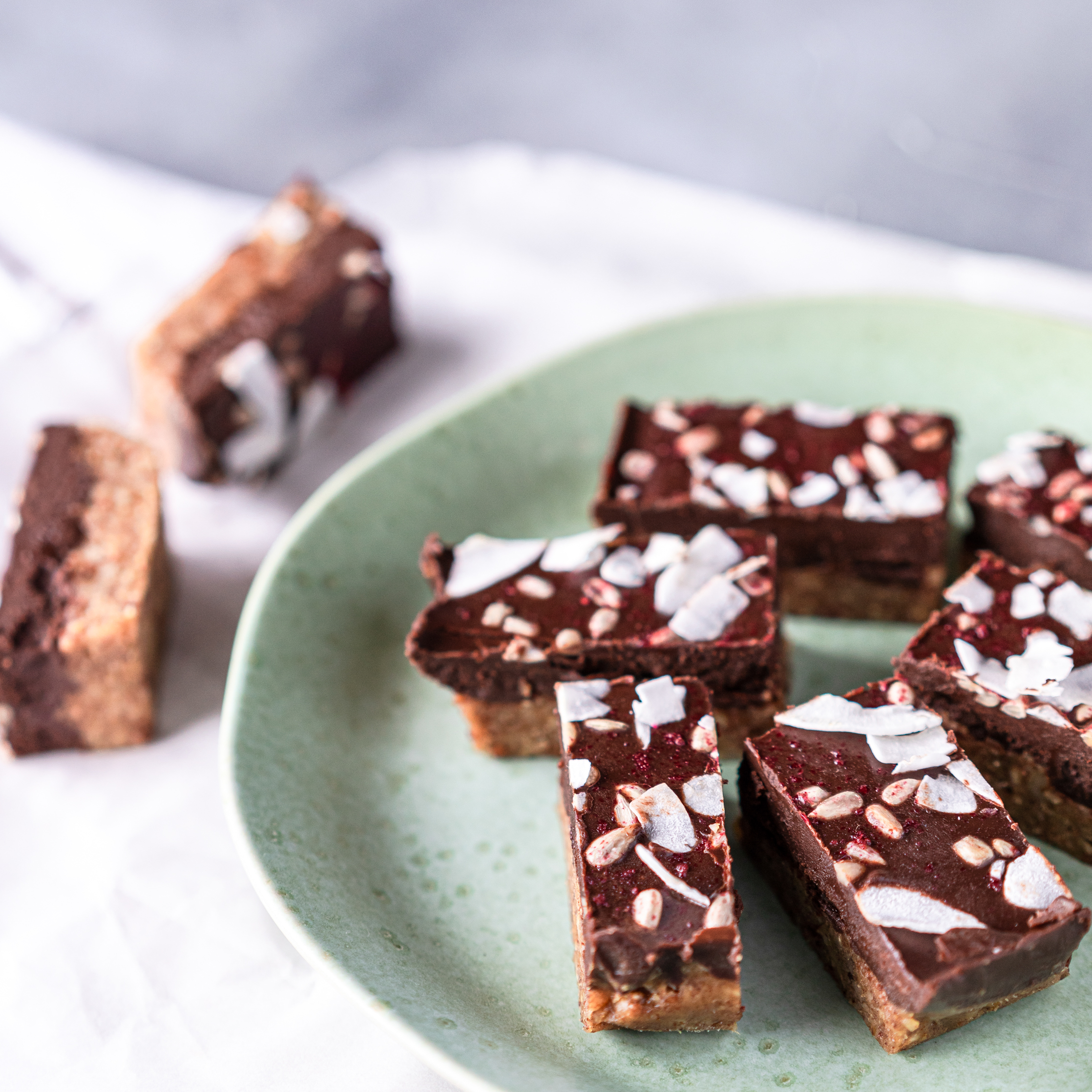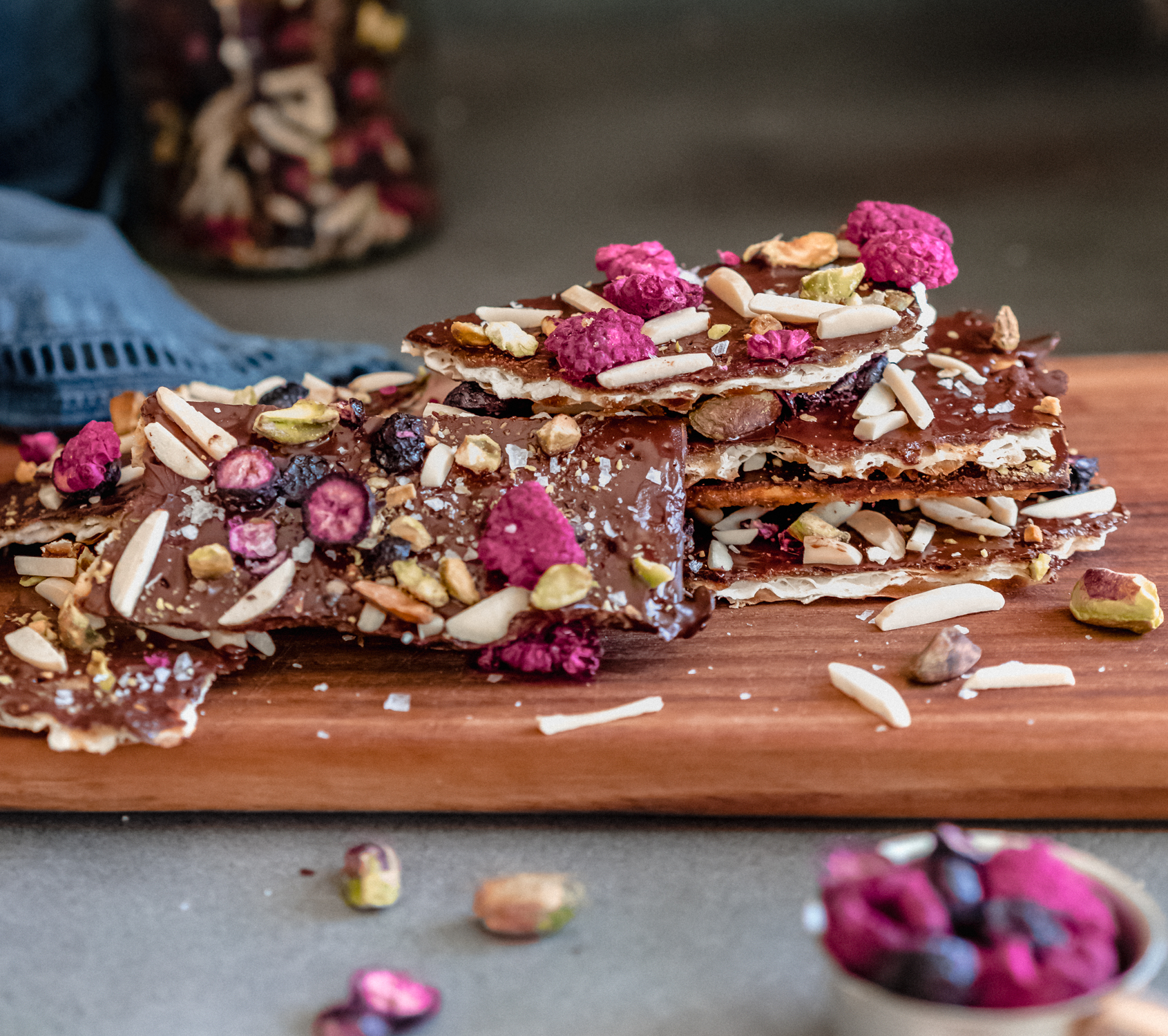 Unleavened flatbread with a thin layer of toffee and chocolate topped with nuts and freeze-dried berries.