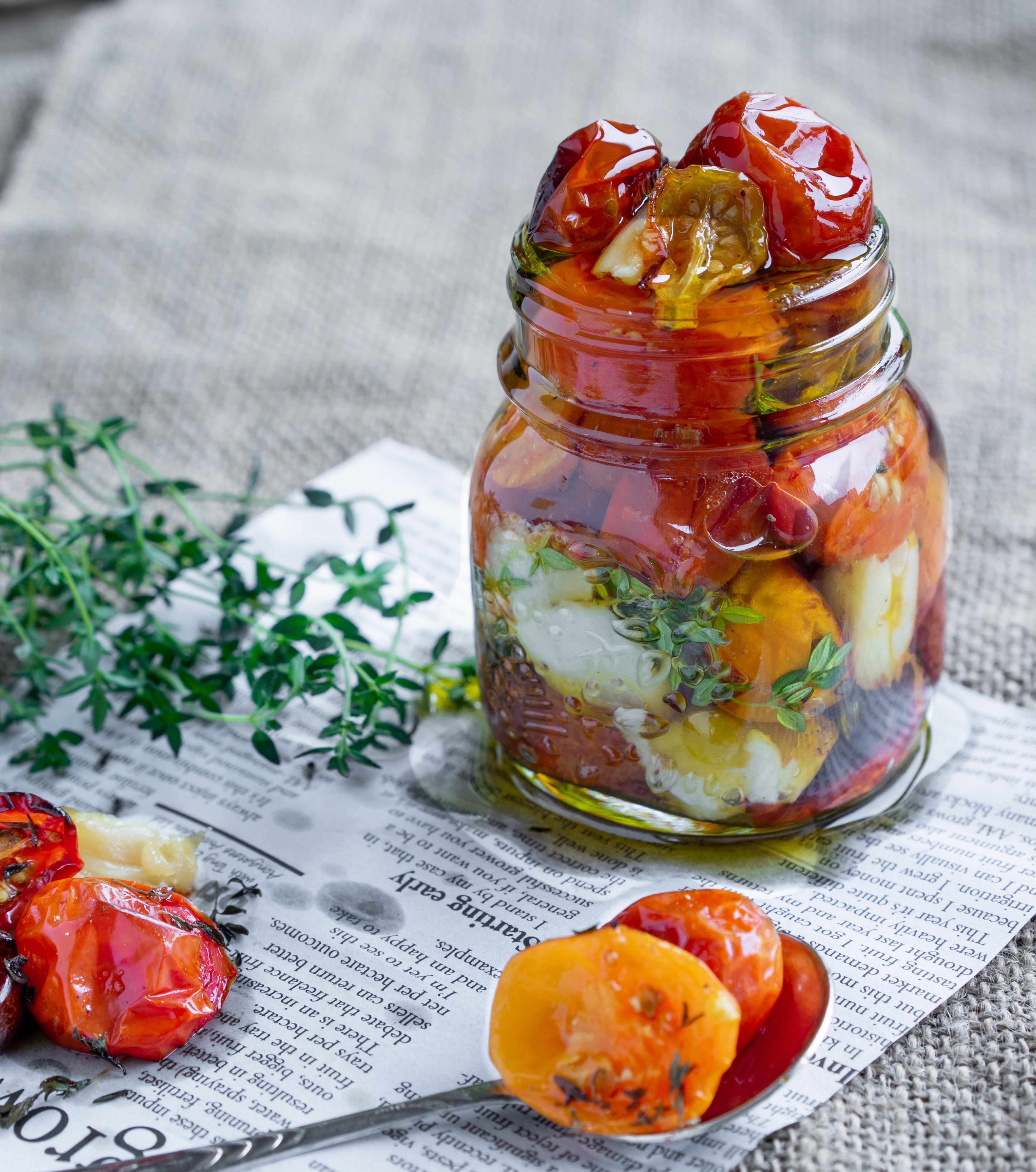 As soon as the weather allowed I had planted tomato plants. Patiently waiting as the young seedlings matured and started to fruit. It's amazing how quickly my garden started producing tomatoes in all sizes and colors. Abi and Eli love eating them and I grew up in a home where tomatoes grew abundantly. You could say tomatoes are a staple in our household and I could go on about the many uses of this vital ingredient in my kitchen. If you are looking for ways to jazz up the humble tomato look no further than my Confit tomato recipe. Pairing it with Thyme and Garlic and slow roasting to perfection transforms the simple tomato into something more sophisticated and bursting with flavor. When storing your gems of tomato use a glass container and add a good dollop of olive oil to cover them. Use the Confit in salads, eggs, quiche, pizzas, pasta, or simply topped on some warm sourdough as bruschetta. It makes me so happy to think I have a batch in my fridge readily available.