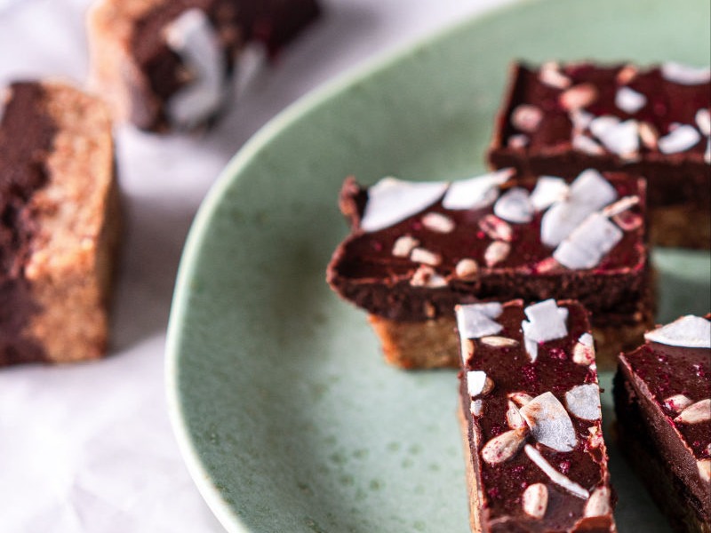 Put base ingredients into a food processor or high speed blender and blend until the base comes together. Place baking paper in a 8 x 8 or any square baking tray.
